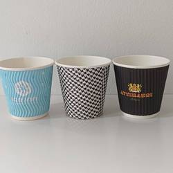 ถ้วยกระดาษลูกฟูกลายริ้วแบบใช้แล้วทิ้งพร้อมฝา2ชั้นและ3ชั้นผนังสองชั้นดีไซน์ออกแบบได้ตามต้องการ